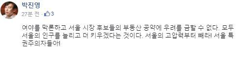 박 부대변인은 2일 소셜네트워크서비스(SNS)에 “여야를 막론하고 서울시장 후보들의 공약에 우려를 금할 수 없다”며 “모두 서울의 인구를 늘리고 더 키우겠다는 것이다. 서울의 고압력부터 빼라!”라고 일갈했다. 그러면서 서울시장 보궐선거에 나선 이들을 ‘서울 특권 주의자’라고 규정했다.