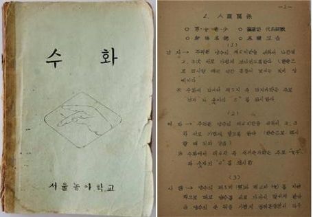 1963년 제작된 한국수어교재 '수화'는 서울농아학교(현 국립서울농학교) 교장과 교사들이 수어를 체계화하고 한글로 설명한 교재로, 농인들이 자주 사용하는 관용적인 수어를 정리했다.