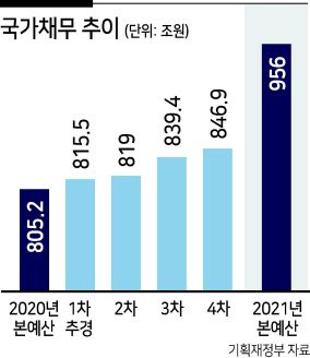 올해 본예산 기준으로 연말 국가채무는 956조원에 달할 전망이다. 국내총생산(GDP) 대비 국가채무비율은 47.3%까지 올라간다. 4차 지원금 지급을 위해 적자국채를 10조원 규모로 발행하면 국가채무는 966조원, 국가채무비율은 47.8%가 된다. 20조원 적자국채를 발행하면 국가채무는 976조원, 국가채무비율은 48.3%에 달하게 된다. 1분기에 추경을 편성한다고 해도 올해 첫 추경일뿐, 백신 접종으로 집단 면역이 형성되기 전 코로나19가 계속될 것을 고려하면 또다시 추경을 편성해야 할지 모르는 상황이다. 올해 안에 국가채무가 1000조원을 돌파할 가능성도 닫아둘 수 없다.