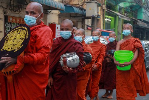 2일 미얀마 양곤에서 승려들이 탁발하고 있다. 미얀마 군부가 쿠데타를 일으켜 노벨평화상 수상자이자 미얀마 실질적 지도자인 아웅산 수치 고문 등 고위 정치인들이 구금된 가운데 수치 고문이 이끄는 민주주의 민족동맹(NLD) 소속 의원 등 수백 명도 갇힌 것으로 알려졌다. [양곤=AP/뉴시스] |