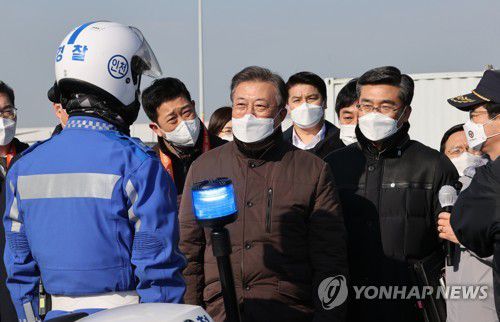 (서울=연합뉴스) 임형섭 기자 = 문재인 대통령은 3일 오전 인천국제공항 대한항공 제2 화물터미널을 찾아 신종 코로나바이러스 감염증(코로나19) 백신 유통을 위한 민·관·군·경 합동 모의훈련을 참관했다.