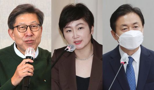국민의힘 소속 박형준 교수(맨 왼쪽), 이언주 전 의원(가운데), 더불어민주당 소속 김영춘 국회 사무총장. 연합뉴스 |