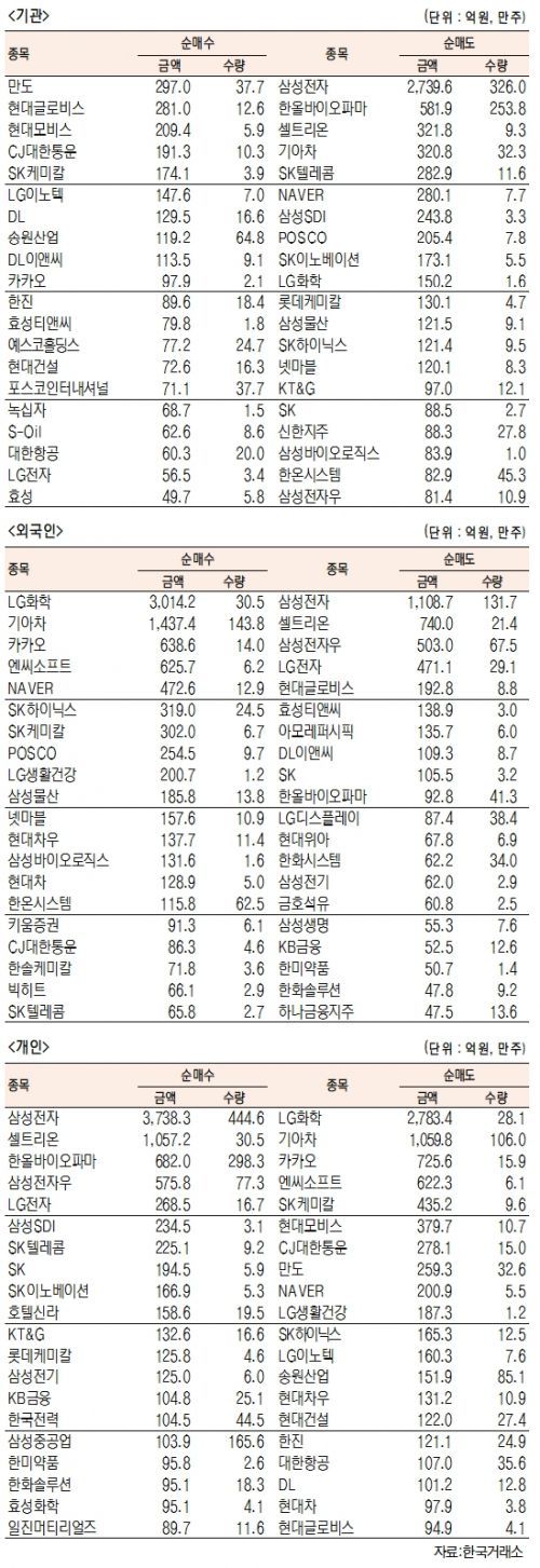 [표]유가증권 기관·외국인·개인 순매수·도 상위종목(2월 3일-최종치)