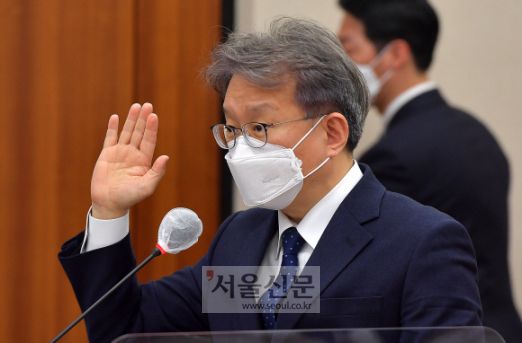 권칠승 중소벤처기업부 장관 후보자가 3일 국회 산업통상자원중소벤처기업위에서 열린 인사청문회에 출석해 선서하고 있다. 권 후보자는 코로나19 피해 구제와 관련해 “4차 재난지원금 지급과 손실보상 법제화가 모두 필요하다”고 밝혔다.