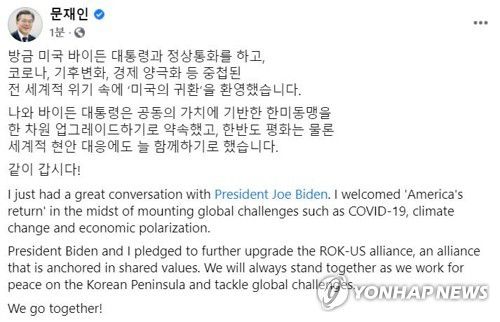 문 대통령은 같은 내용의 영문 메시지를 함께 게시했다. 이번 한미 정상통화는 바이든 대통령이 지난달 20일 취임한 이후 14일 만에 이뤄진 것이다. 한반도 평화프로세스와 한미동맹 강화 방안 등 주요 현안 외에도 한미일 안보협력 구상, 미중 무역갈등에 대한 논의가 이뤄졌을지 주목된다. 앞서 문 대통령은 바이든 대통령이 당선인 신분이던 지난해 11월 12일에도 통화한 바 있다.