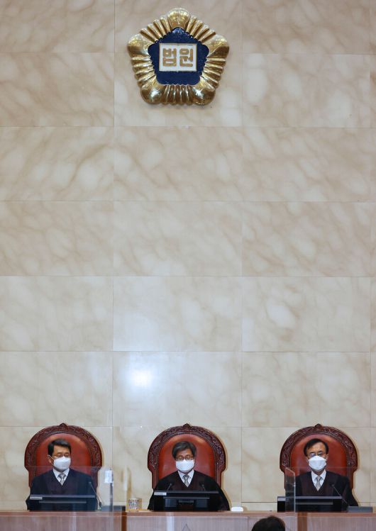 김명수 대법원장(가운데)이 지난해 11월 서초구 대법원에서 열린 전원합의체 선고에서 눈을 감고 있다. 연합뉴스 |