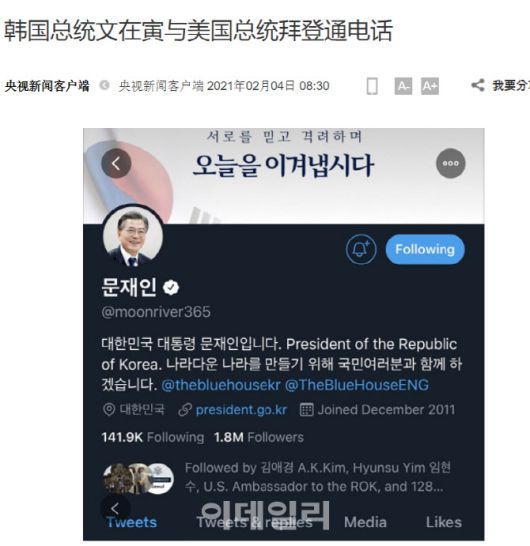 중국 CCTV가 문재인 대통령의 트위터를 캡쳐해 바이든 대통령과의 대화에 대해 보도했다. |