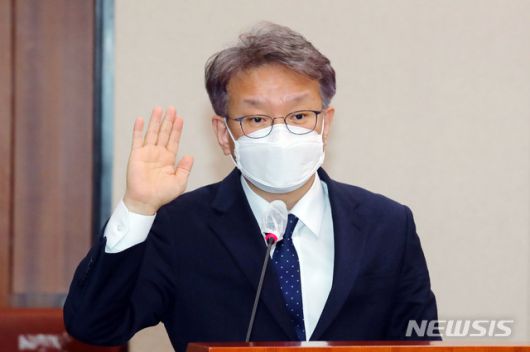 [서울=뉴시스]최동준 기자 = 권칠승 중소벤처기업부 장관 후보자가 3일 서울 여의도 국회 산업통상자원중소벤처기업위원회에서 열린 인사청문회에서 선서를 하고 있다. (공동취재사진) 2021.02.03. photo@newsis.com |
