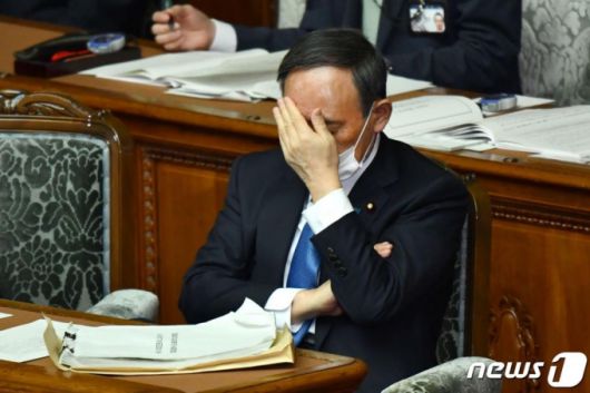 스가 요시히데 일본 총리가 18일(현지시간) 도쿄 정기국회에서 시정방침 연설을 마치고 앉아 있다. 2021.01.18./사진=(도쿄 AFP=뉴스1) |