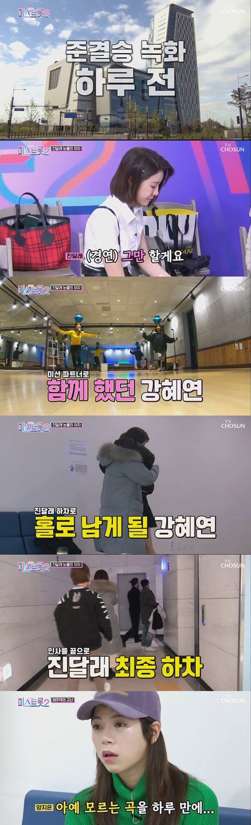 그렇게 진달래가 '미스트롯2'을 떠나는 줄 알았더니, 지난 4일 방송 말미 그의 모습을 볼 수 있었다. 앞선 녹화분에서는 통편집됐으나, 그가 준결승 녹화를 하루 앞두고 눈물을 흘리는 모습이 전파를 탄 것.