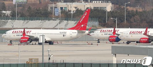 5일 인천국제공항 제1여객터미널 계류장에 이스타항공 여객기가 운행을 앞두고 대기하고 있다. 2021.2.5/뉴스1