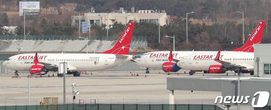 5일 인천국제공항 제1여객터미널 계류장에 이스타항공 여객기가 운행을 앞두고 대기하고 있다. 2021.2.5/뉴스1
