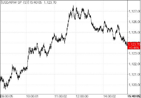5일 서울외국환중개에 따르면 원·달러 환율은 전 거래일 종가(1118.50원)대비 5.2원(0.46%) 오른 1123.70원에 마감했다. 종가 기준 1120원대를 돌파한 것은 지난 11월 6일(1120.40원) 이후 약 3개월만이다. 이날 환율은 전 거래일 종가(1118.50원)대비 2.5원 오른 1121원에 출발해 장중 한 때 1127.80까지 치솟았다가 수출업체들의 네고 물량(달러 매도)에 상승폭을 축소해갔다.