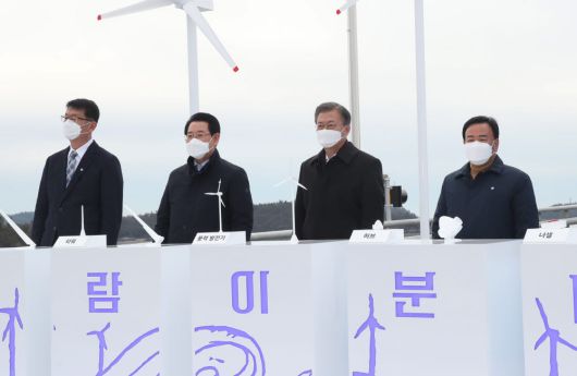 문재인 대통령은 5일 전남 신안군 임자대교에서 열린 '세계 최대 해상풍력단지 투자협약식'에 참석해 “신재생 에너지 자체가 미래 성장 산업이 돼서 많은 일자리를 만들어내고 우리 경제를 도약시키는 계기가 될 것”이라고 말했다.