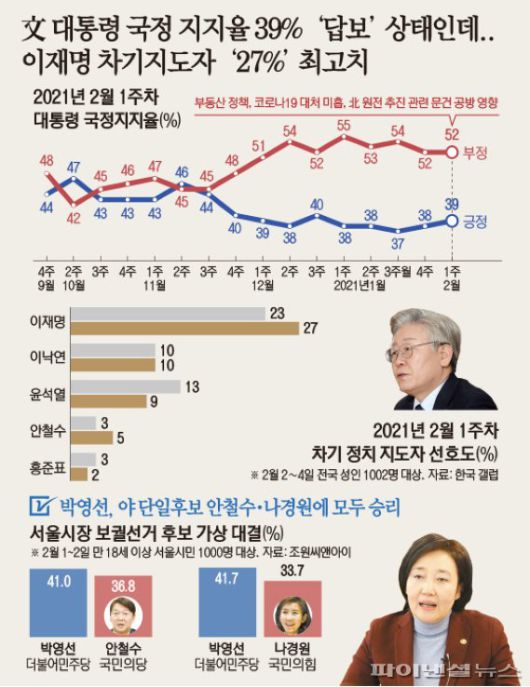 5일 여론조사 전문기관 한국갤럽이 지난 2~4일 전국 18세 이상 성인 1002명을 상대로 ‘문 대통령이 직무를 잘 수행하고 있다고 보는지’ 물은 결과 2월 1주차 문 대통령 국정수행 지지율은 전주 대비 1%포인트 상승한 39%를 나타냈다. 부정평가는 전주와 동일한 52%였다.