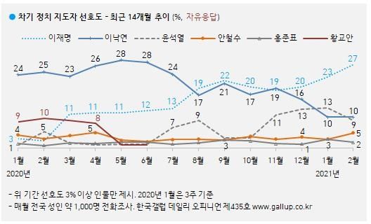한국갤럽이 지난 2~4일 전국 만 18세 이상 1천2명을 대상으로 다음번 정치 지도자, 즉 차기 대통령으로 누가 좋다고 생각하는지 물은 결과 이 지사는 27%로 1위를 차지했다.