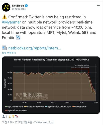 5일 오후 10시부터 미얀마 트위터 접속이 제한되고 있음을 보여주는 그래프. |