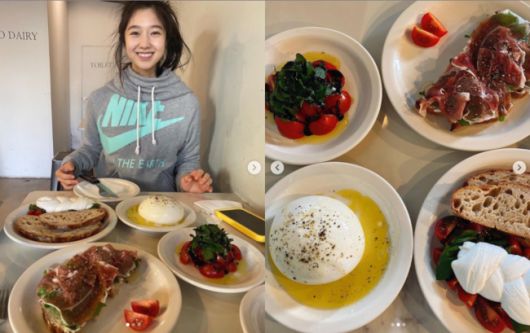 공개된 사진에서 그는 각종 샐러드와 부라차 치즈, 빵을 앞에 두고 행복한 미소를 짓고 있다. 운동복 차림에 수수한 매력이 돋보이는데 귀신 산발을 하고 있어 눈길을 끈다.