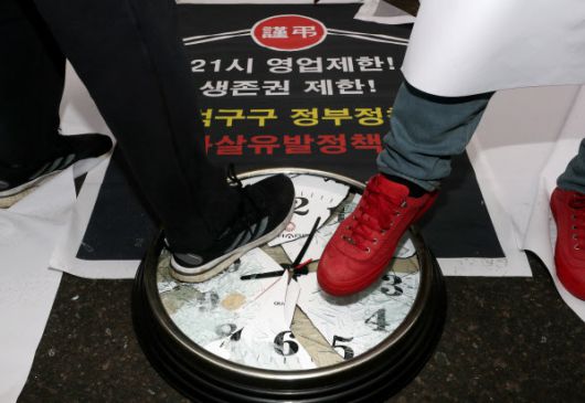 음식점·호프 비상대책위원회 자영업자들이 지난달 15일 오후 서울 여의도 더불어민주당 당사 앞에서 열린 생존권 보장 요구 집회에서 9시를 가리키는 시계를 밟는 퍼포먼스를 하고 있다. (사진=뉴시스) |