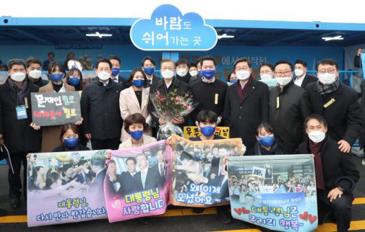 전남도청 직원 10여명은 시장 앞에서 플랜카드, 현수막을 들고 문 대통령을 맞이했다. 이날 직원들이 들고 온 플랜카드와 현수막에는 “그거 알아요? 저 굴 좋아하는 거. 문재인 얼굴” “문재인 너는 사슴. 내 마음을 녹용(녹여요)” “문재인 별로. 내 마음의 별(星)로” “대통령님 사랑합니다” “왜 이제 오셨어요” “대통령님은 우리의 행복” “다시 만나 반갑습니다” 등의 문구가 적혀 있었다.