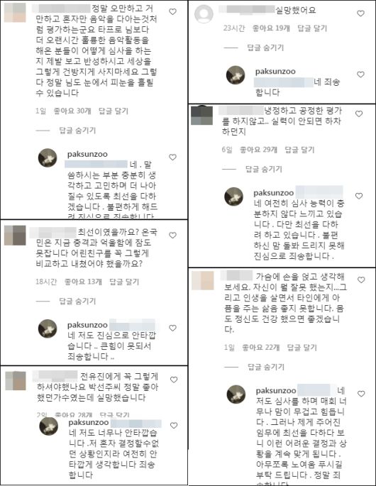 또 "냉정하고 공정한 평가를 하지 않고. 실력이 안되면 하차하던지"라는 비아냥 댓글에 박선주는 "여전히 심사능력이 충분하지 않다 느끼고 있다. 다만 최선을 다하려 하고 있다. 불편하신 맘 돌봐 드리지 못해 진심으로 죄송하다"라고 말했다.