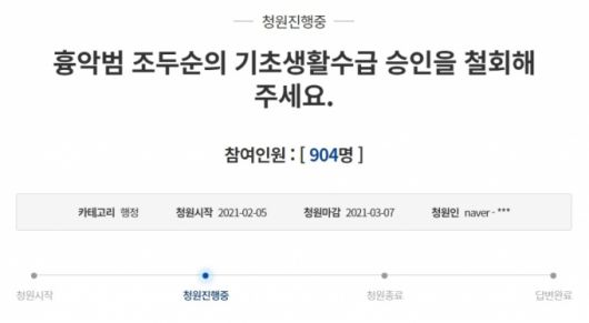 지난 5일에는 "흉악범 조두순의 기초생활수급 승인을 철회해 주세요"라는 제목의 국민청원이 새로 올라왔다. 다음달 7일까지 동의 20만명을 획득할 경우 청와대가 답변해야 한다. 8일 오전 7시 현재 동의 인원은 904명이다.
