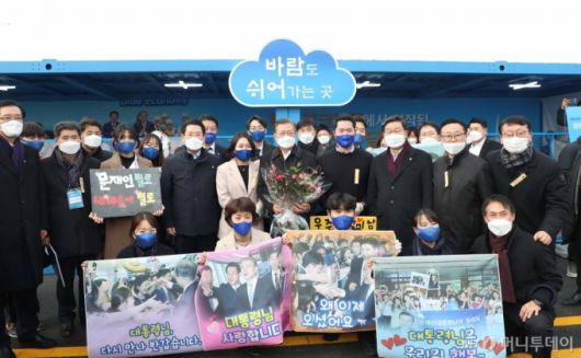 [신안=뉴시스]박영태 기자 = 문재인 대통령이 5일 오후 설 연휴 임시개통 예정인 전남 신안군 임자2대교에서 열린 세계 최대 해상풍력단지 48조원 투자협약식을 마친 뒤 전남도청 직원들과 기념촬영을 하고 있다. 2021.02.05. since1999@newsis.com |