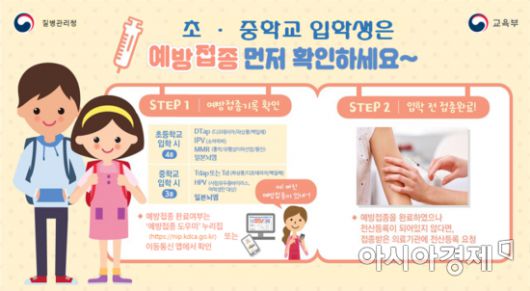 8일 질병관리청과 교육부, 지방자치단체와 학교장은 필수 예방접종을 권고하고 관련법에 따라 입학생의 예방접종을 완료 여부를 확인한다고 밝혔다. 입학을 앞둔 자녀의 보호자는 예방접종도우미 홈페이지나 모바일 앱에서 예방접종 내역을 확인하고 접종 후 기관에 전산등록을 요청하면 된다.