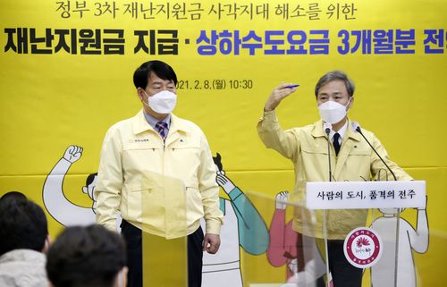 김승수 전주시장과 강동화 전주시의회 의장은 8일 시청에서 기자회견을 열어 정부 3차 재난지원금의 사각지대를 해소하기 위해 7개 분야, 총 152억3천만원 규모의 지원을 뼈대로 한 '전주형 3차 재난지원금'을 지급한다고 밝혔다.