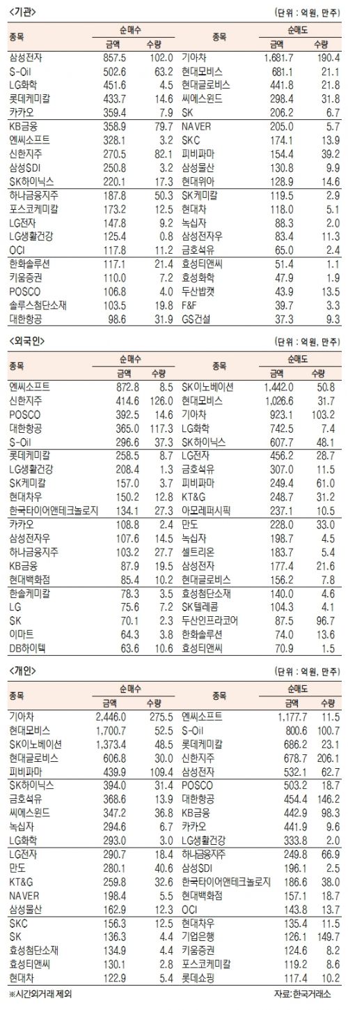[표]유가증권 기관·외국인·개인 순매수·도 상위종목( 2월 8일)