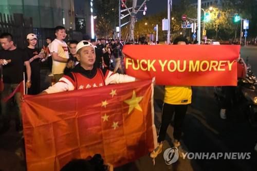 2019년 10월 12일 상하이에서 NBA 시범경기 전에 사람들이 대릴 모리 휴스턴 로키츠 단장에 항의하는 현수막과 중국 국기를 들고 있는 모습. [AFP=연합뉴스 자료사진] |