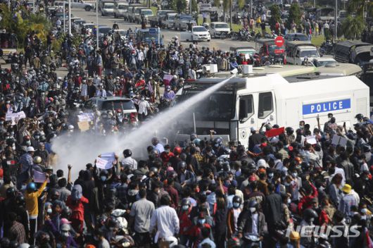 수도 네피도에선 경찰이 시위대를 해산시키기 위해 물대포를 쏘는 장면이 목격되기도 했다. 아울러 네피도 경찰은 시위대에 해산을 명령하며 응하지 않을시 강제 조치를 하겠다고 경고했다.