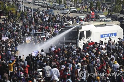 수도 네피도에서 경찰이 쿠데타 항의 시위대를 향해 물대포를 쏘고 있다.2021.2.8 |