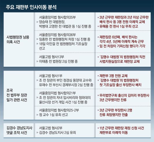 조국 전 법무부 장관의 부인 정경심 동양대 교수에게 1심에서 유죄를 선고한 재판부는 잔류 신청이 받아들여지지 않았다. 정 교수 사건의 재판장인 임정엽, 김선희 부장판사는 각각 서울중앙지법에 3년간 근무했다는 이유로 이번 인사에서 서울서부지법으로 전보 조치됐다. 정 교수의 2심 재판을 맡은 서울고법 형사1부는 재판부가 모두 교체됐다. 재판부에는 김명수 대법원장이 취임 후 첫 법원행정처 기획조정실장에 임명한 이승련 서울고법 부장판사가 배치됐다. 이 부장판사는 평소 주변에 조 전 장관에 대한 검찰 수사에 비판적인 의견을 낸 것으로 알려져 있다. 조 전 장관 사건 담당인 김미리 부장판사는 서울중앙지법에서 3년 근무했지만 4년째 유임됐다. 김 부장판사는 지난해 6월 조 전 장관 재판에서 “검찰 개혁을 시도한 피고인에 대한 검찰의 반격이라 보는 일부 시각이 있다”고 말해 논란이 일었다. 한 법관은 “인사 원칙이 존재하는 이유는 독립적인 재판을 할 수 있도록 보장하기 위한 것”이라며 “재판 결과에 따라 인사가 달라지면 되겠느냐”고 했다.