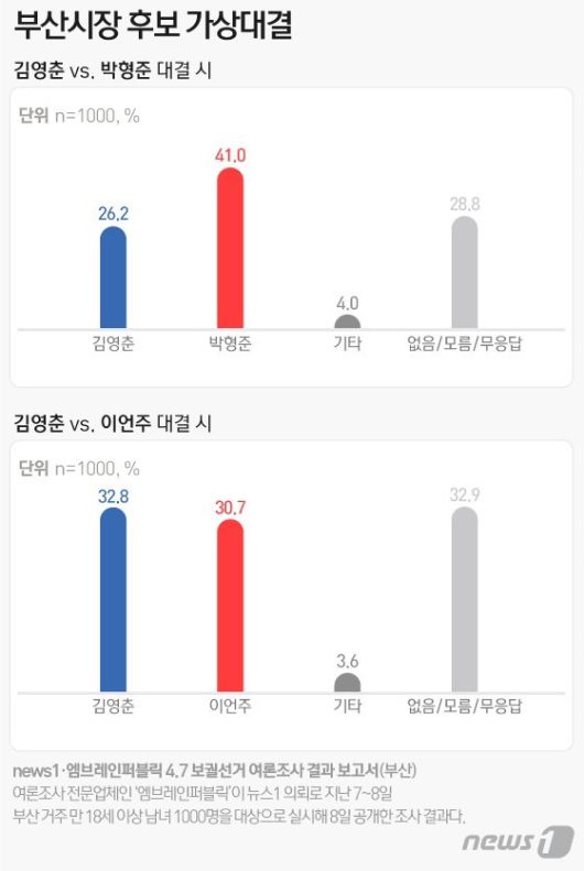 여론조사 전문업체인 엠브레인퍼블릭이 뉴스1 의뢰로 지난 7~8일 부산에 거주하는 만 18세 이상 남녀 1000명을 대상으로 실시해 9일 공개한 조사 결과에 따르면, '김영춘 더불어민주당 예비후보와 박형준 국민의힘 예비후보가 대결한다면 누구에게 투표할 생각이냐'는 물음에 응답자의 41.0%가 박 후보를 답했다. 김 후보의 선호도는 26.2%에 그쳤다.