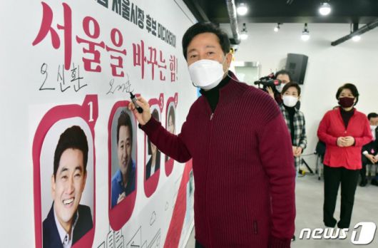 (서울=뉴스1) 박세연 기자 = 오세훈 국민의힘 서울시장 보궐선거 예비후보가 8일 서울 여의도 국민의힘 중앙당사에서 서울시장 선거 본경선 미디어데이에서 경선 후보자 기호 추첨을 마친 뒤 자신의 사진에 사인을 하고 있다. 2021.2.8/뉴스1 |