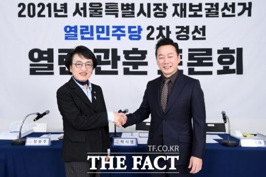 9일 열린민주당 서울시장 후보로 김진애 의원이 확정됐다. 지난 4일 열린민주당 2차 경선 열린 관훈 토론회 전 악수하는 정봉주 열린민주당 서울시장 경선 후보(오른쪽)와 김진애 열린민주당 서울시장 경선 후보. /남용희 기자 |