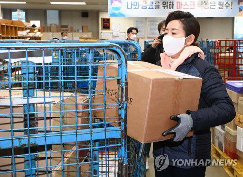 중앙우체국 방문해 택배분류 작업하는 나경원 |