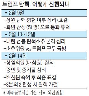 시작점인 9일 오후 양당은 이미 퇴임한 대통령을 상대로 탄핵을 하는 게 합헌인지 토론을 벌여 표결한다. 과반 찬성으로 의결되는 이날 표결은 민주당 구상대로 합헌으로 의결될 가능성이 크다. 상원은 지난달 26일에도 같은 사안을 놓고 표결을 진행해 심판이 가능하다는 결론을 낸 바 있다.