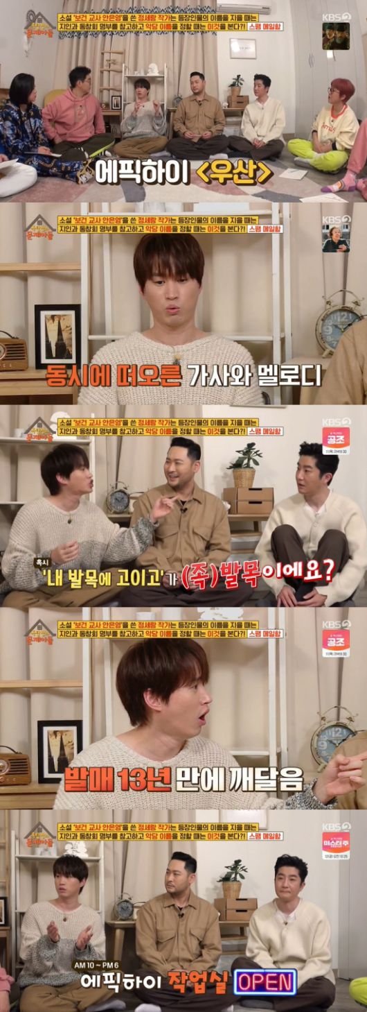 또 타블로는 가장 빨리 쓴 노래로 '우산'을 언급했고, "제일 빨리 쓴 노래가 에픽하이의 '우산'이라는 노래다. '우산'이라는 노래가 저희의 히트곡 중 사랑받는 노래다. 멜로디랑 가사랑 동시에 흥얼댄 다음에 녹음을 해놨다. 족발 먹다가 만들었다. 족발 먹다가 내려가서 녹음을 해놓고 다시 족발 먹었다"라며 비하인드스토리를 공개했다.