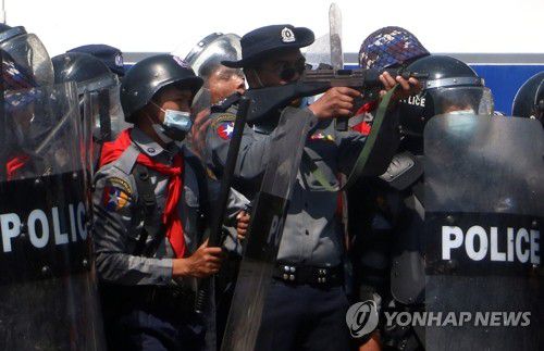 쿠데타 규탄 시위대에 총 겨누는 미얀마 경찰 |