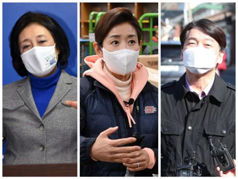 왼쪽부터 박영선 더불어민주당 예비후보, 나경원 국민의힘 예비후보, 안철수 국민의당 대표.(사진=연합뉴스) |