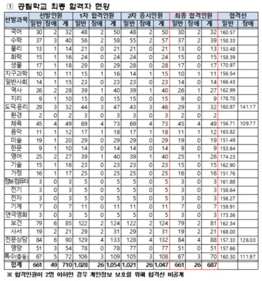 중등교사와 보건·사서·영양·전문상담, 특수교사 최종합격자는 28개 과목, 총 689명(국립 2명 포함)이다. 지난해(852명)보다 163명 감소했다.
