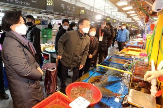 문 대통령 내외는 시장 점포 이곳저곳을 둘러보고 전통시장 전용 상품권인 온누리상품권으로 수산물, 젓갈, 건어물, 꽃게 등을 직접 구입하면서 코로나19로 어려운 시장상인들의 애로사항을 청취했다.