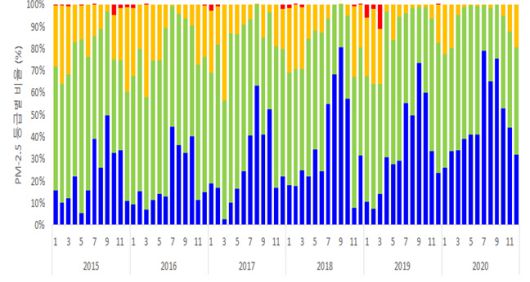 연도별·월별 한국 초미세먼지 농도 등급별 발생 비율(%). 환경부 제공 |