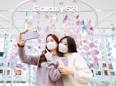 서울 강남구 삼성 디지털프라자 삼성대치점에서 소비자들이 ‘갤럭시 S21’로 셀피를 촬영하고 있는 모습. [삼성전자 제공] |