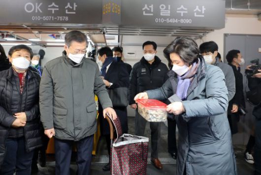 이날 문 대통령 내외가 구입한 물건은 김정숙 여사 직접 가져온 관저에서 사용하던 용기에 담겼다. 플라스틱 사용을 줄이는 '용기내 캠페인'에 동참하고 탄소중립을 실현하는 차원이다. 김 여사는 구매한 해산물 등을 설 명절기간 근무중인 직원들을 위해 청와대 구내식당에 전달했다.