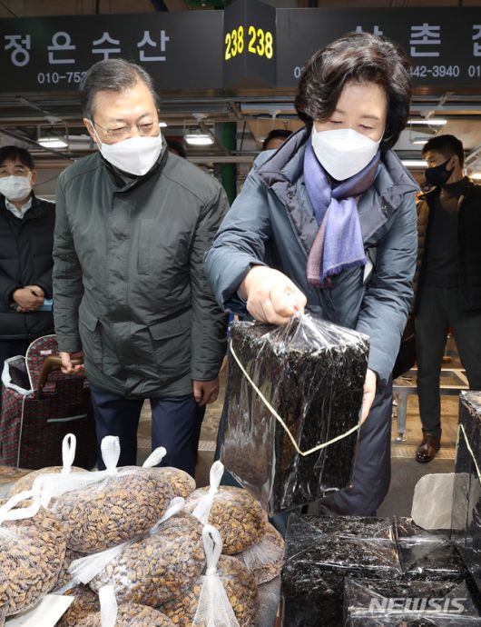 문 대통령과 김 여사는 이날 9곳의 점포를 샅샅이 둘러보며 코로나19로 어려움을 겪는 시장 상인들의 고충도 들었다. 김 여사는 전통시장 전용 상품권인 온누리상품권으로 해산물 등을 구입했고, 문 대통령은 그 옆에서 빨간 장바구니 카트를 끌었다.