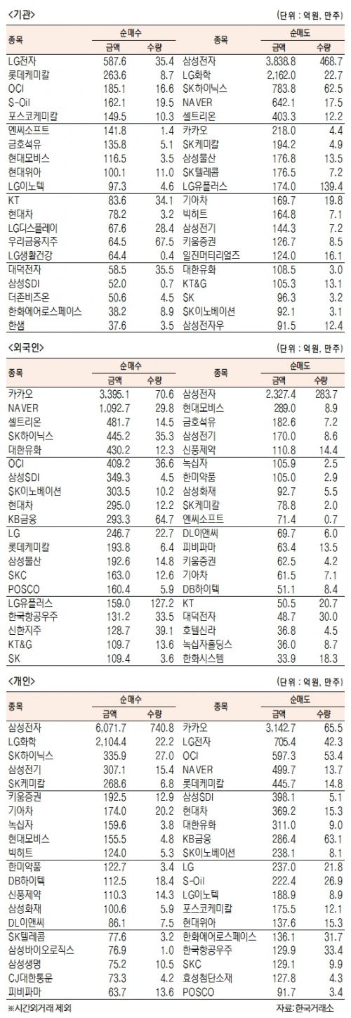 [표]유가증권 기관·외국인·개인 순매수·도 상위종목(2월 10일)