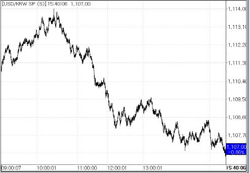 10일 서울외국환중개에 따르면 원·달러 환율은 전 거래일 종가(1116.60원) 대비 9.6원(0.86%) 내린 1107.00원에 마감했다. 이날 환율은 전 거래일 종가 대비 5.6원 하락한 1110.95원 출발에서 시작해 장중 한때 1114원까지 올랐지만 점차 낙폭을 키워갔다.